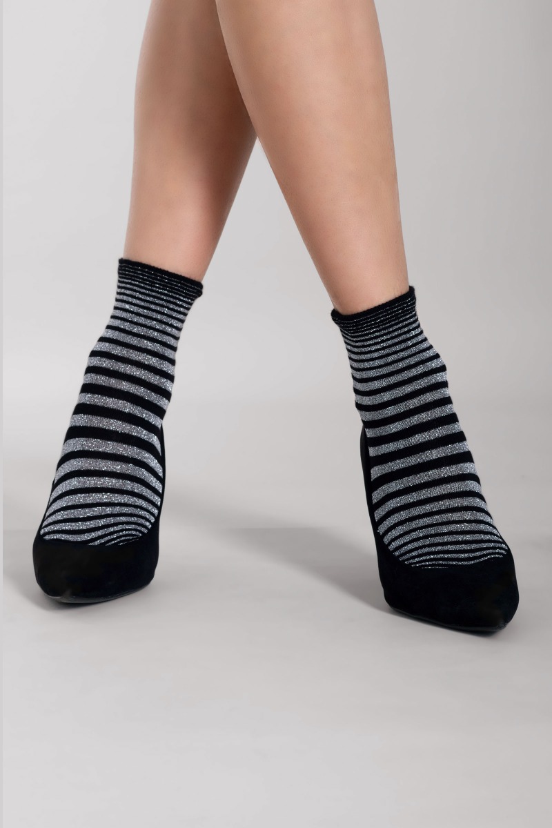 Calzino in cotone con righe orizzontali irregolari in lurex.