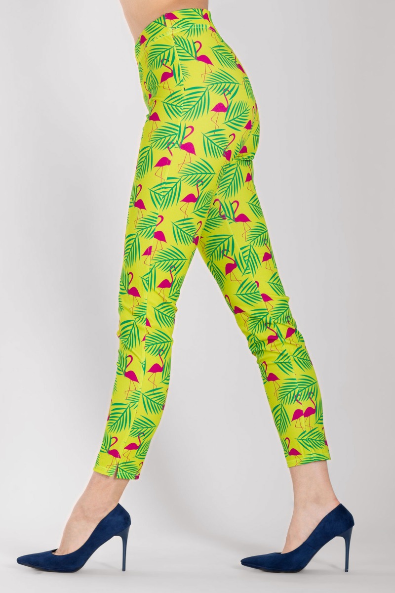 Legging tagliato e cucito, prodotto con tessuto aderente stampato a motivo foglie e fenicotteri.